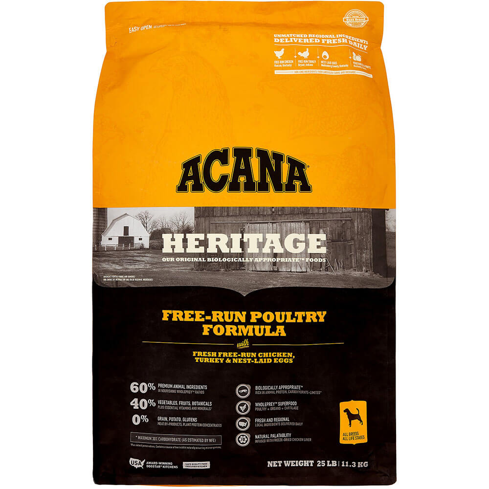 Feed your furry friend a meal that’s nutritious, delicious and full of protein with ACANA Free-Run Poultry Recipe Grain-Free Dry Dog Food. This wag-worthy recipe is crafted with 60% animal ingredients including free-run chicken and turkey, plus cage-free eggs and 40% fruits, vegetables and botanicals. There are also vitamins, minerals, natural preservatives and probiotics added, and zero artificial colors, flavors or preservatives. ACANA always uses premium ingredients from a curated group of trusted farmers, ranchers and fishers, and every batch of food is made in their state-of-the-art Kentucky kitchen.