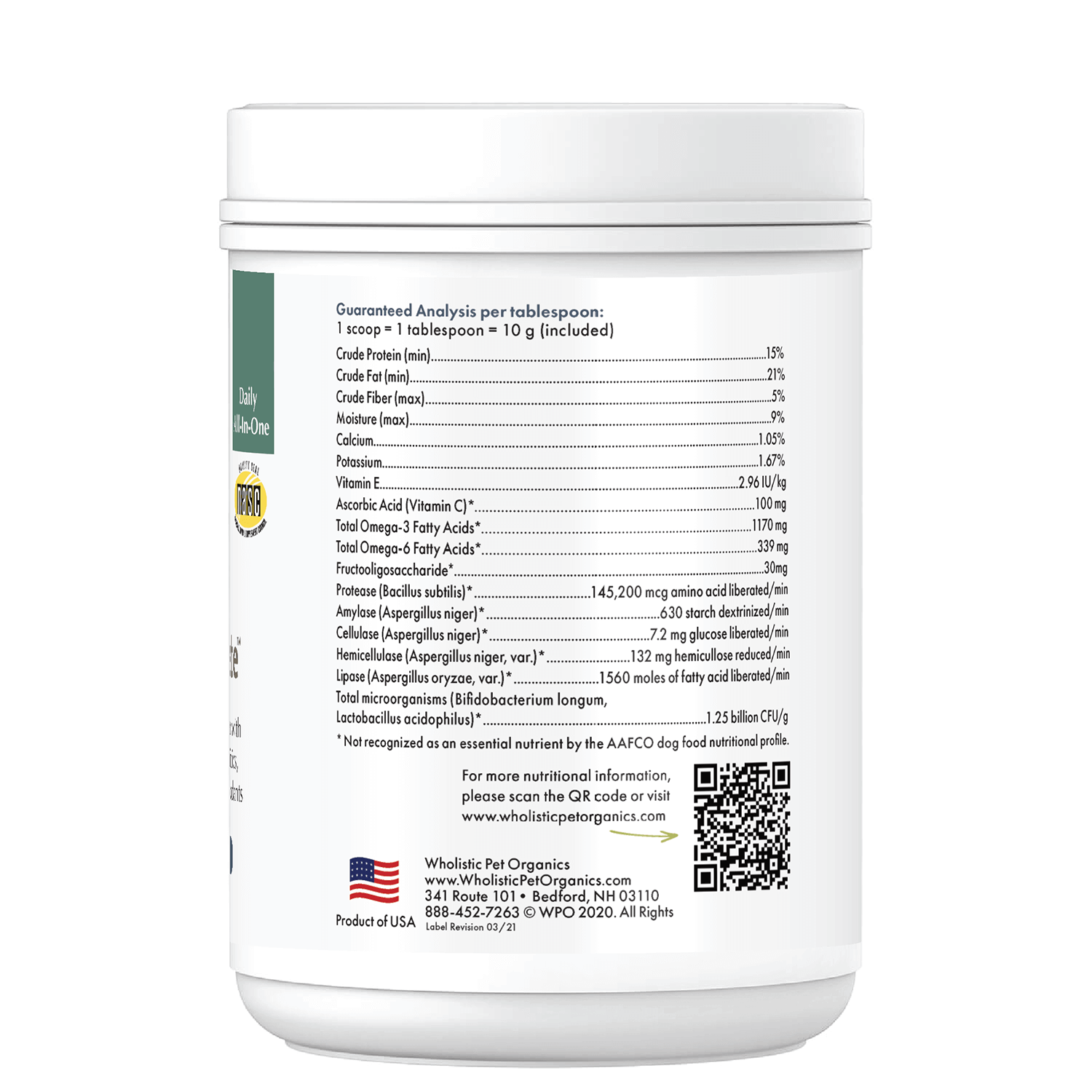 Dogs, just like us, can only reach their genetic potential if their diet delivers maximum nutrition. Most commercial dog foods cannot achieve this lofty goal because they are not formulated to do so. What’s more, no one dog food can meet every dog’s individual needs. To enjoy robust health, your dog should receive a high quality vitamin/mineral supplement, alongside essential fatty acids, digestive enzymes, and other nutrients. Wholistic Canine Complete™ accomplishes these goals with one easy-to-use complete supplement.