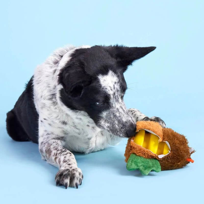 This durable rooster dog toy has two layers of play for Super Chewers to enjoy. Underneath Fowl Play’s extra tough plush layer is an all-natural rubber core with a hidden treat dispenser. He’s a hard bird to pin down because a rock + wobble rounded base means each bounce is unpredictable.