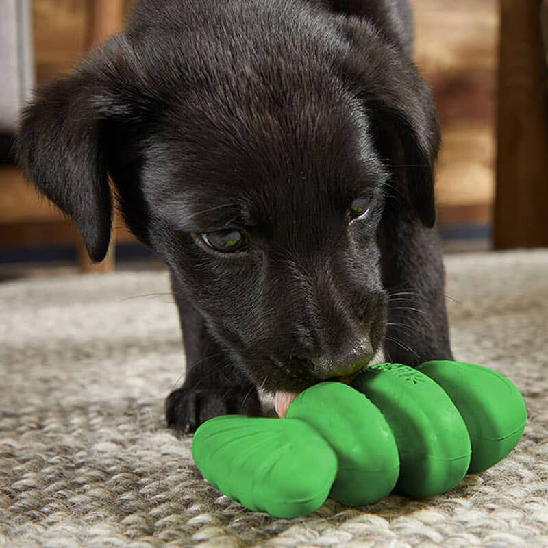 This durable fish dog toy is perfect for dogs who look like minnows but chew like sharks. Made for smaller Super Chewers, Cod Almighty’s tough plush layer covers an all-natural rubber core with hidden grooves for peanut butter. Plus, gnaw-friendly textures keep dogs interested long after their first chomp.