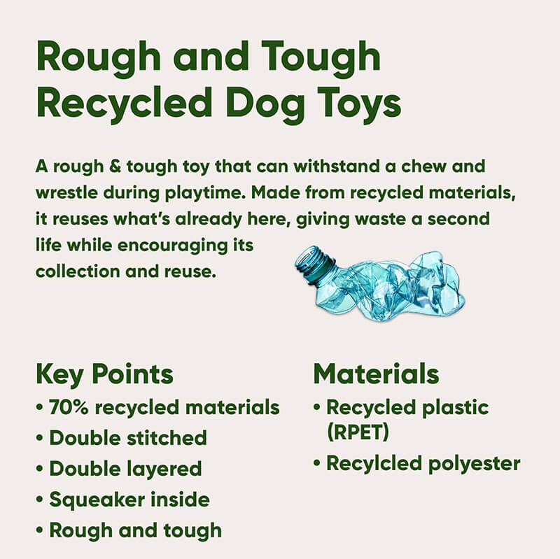 Some dogs believe in tough love. This is for them. A rough & tough toy that can withstand a chew and wrestle during playtime. Made from recycled materials, it reuses what’s already here, giving waste a second life while encouraging its collection and reuse.