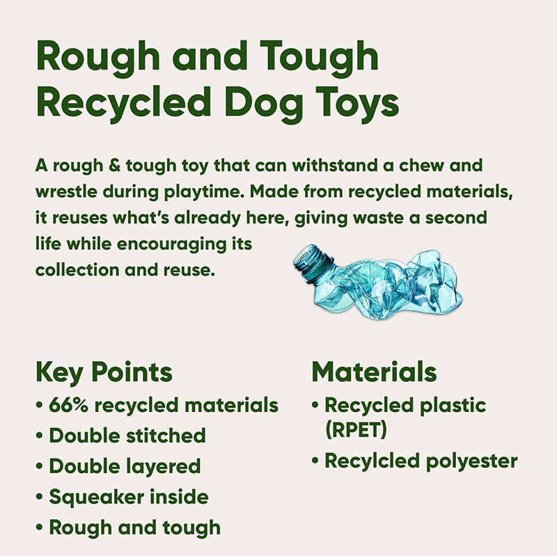 Some dogs believe in tough love. This is for them. A rough & tough toy that can withstand a chew and wrestle during playtime. Made from recycled cloth and stuffing, it reuses what’s already here to help keep our oceans clean.
