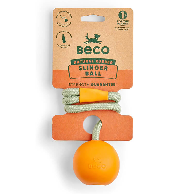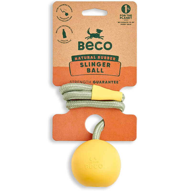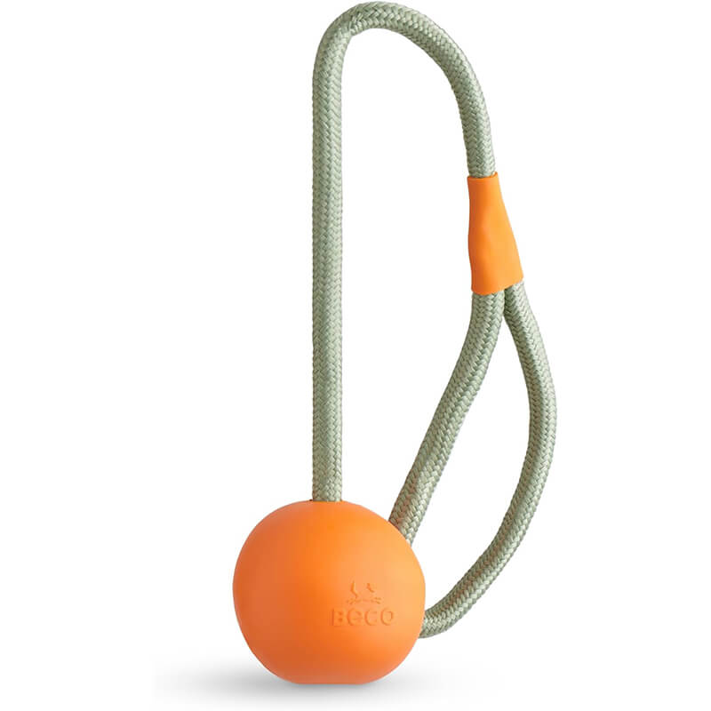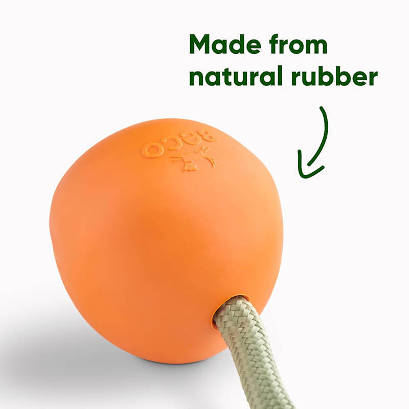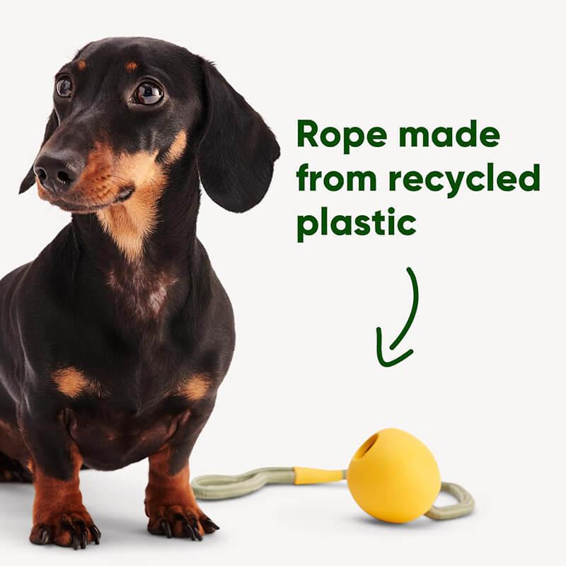A natural rubber ball on a strong recycled rope. The springy natural rubber ball is easy for your dog to grip and the rope gives you extra throwing distance. Ideal for a game of fetch. The rubber has a gentle vanilla scent.