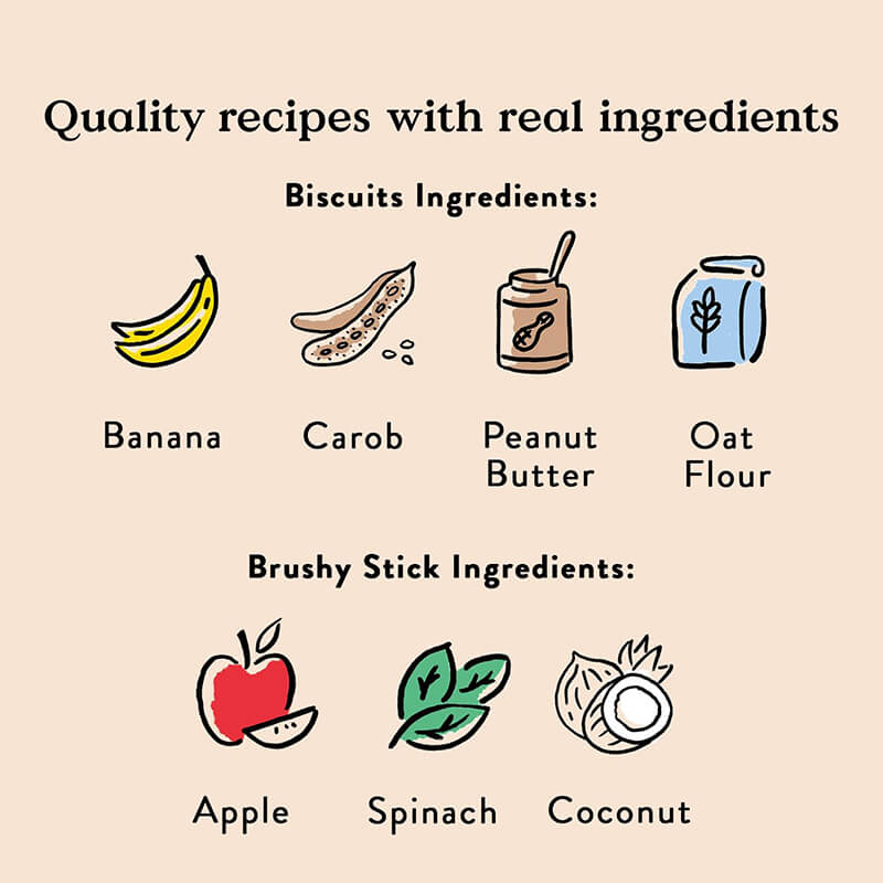 MEDIUM SIZED BRUSHY STICKS Ingredients: Chickpea, Tapioca Flour, Coconut Glycerin, Apples, Brewer’s Dried Yeast, Coconut, Spinach, Salt, Turmeric, Organic Dried Kelp, Parsley, Lactic Acid (Preservative), Peppermint Oil, Citric Acid (Preservative), Mixed Tocopherols (Preservative)
