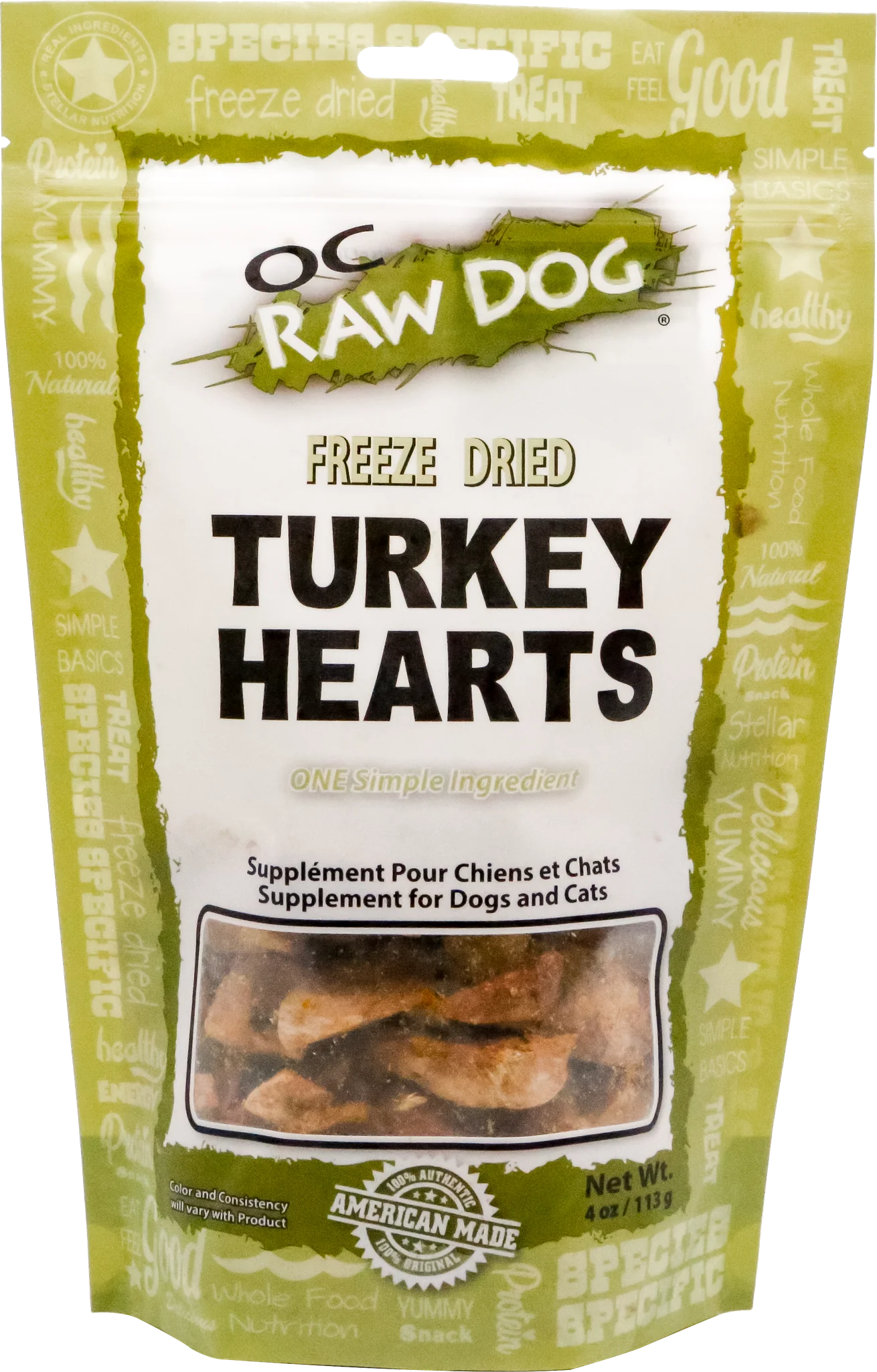 OC Raw’s Freeze Dried Turkey Hearts are treats designed to supplement a raw or dry diet.