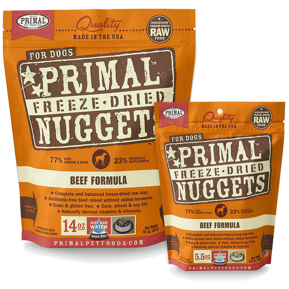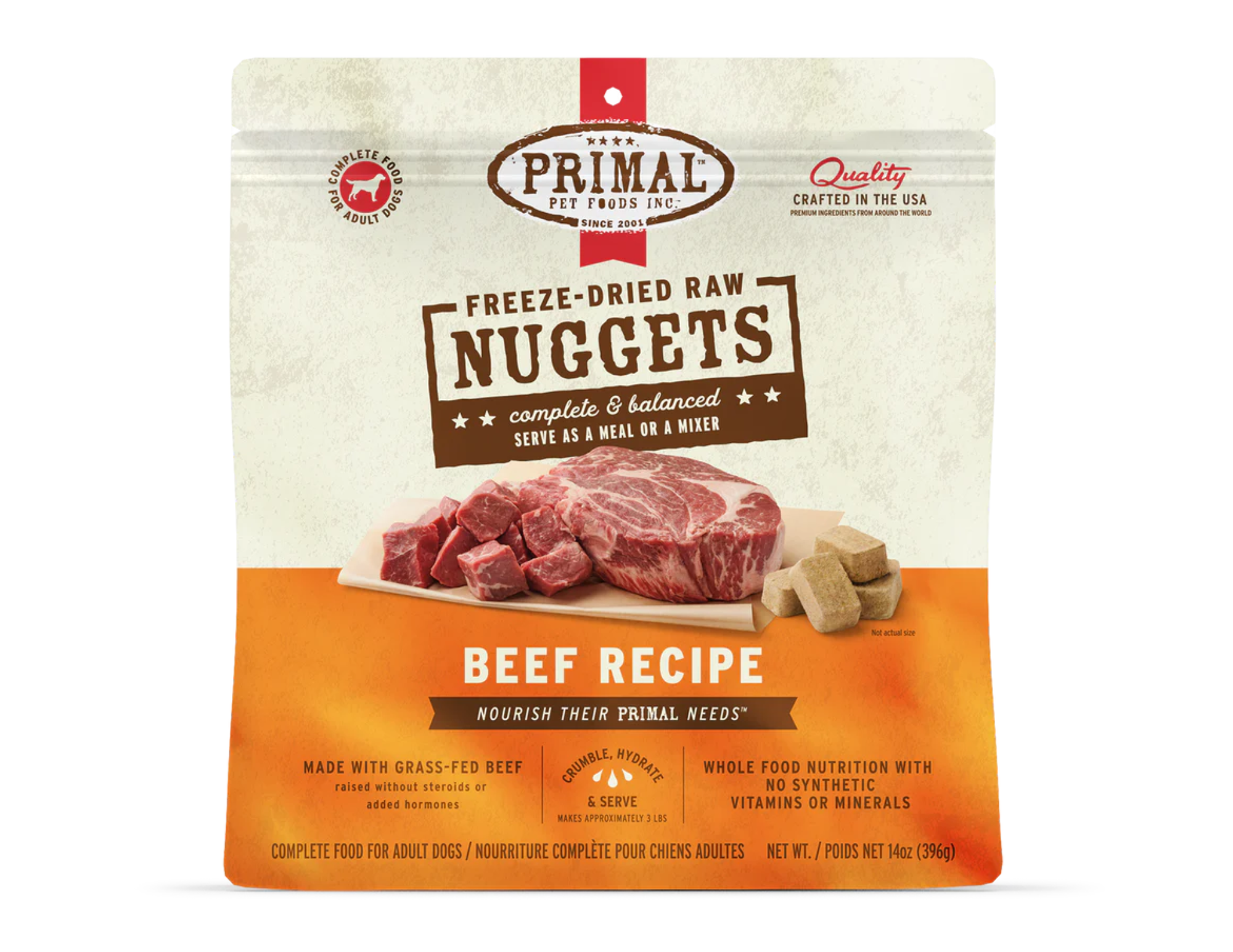 Primal Beef Formula Nuggets Grain-Free Raw Freeze-Dried Dog Food offers your hungry pooch all the benefits of a safe and wholesome raw-food diet—without you having to grind, chop, measure or mix the ingredients yourself! Taking great pride to source only the best ingredients, this tasty and nutritious diet is packed with naturally derived vitamins and minerals. The high-protein ratio appeals to your canine companion’s primal diet, and it’s an excellent way to maintain a proper weight and boost overall health. And best of all, it’s a breeze to serve, thanks to the naturally preserved nuggets—just add water! The proof comes in watching him lick the bowl clean while thriving happily and healthfully.
