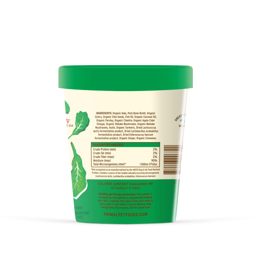 Organic Kale, Pork Bone Broth (Filtered Water, Pork Bones, Organic Carrots, Organic Butternut Squash, Organic Apple Cider Vinegar, Organic Celery, Organic Bok Choy, Organic Cilantro, Organic Parsley, Organic Ginger, Organic Turmeric), Organic Celery, Organic Chia Seeds, Sardine Oil, Organic Coconut Oil, Organic Parsley, Organic Cilantro, Organic Apple Cider Vinegar, Organic Ginger, Organic Turmeric, Organic Mushrooms (Dried Shiitake, Dried Maitake), Dried Lactobacillus lactis fermentation product, Dried Lactobacillus acidophilus fermentation product, Dried Enterococcus faecium fermentation product.