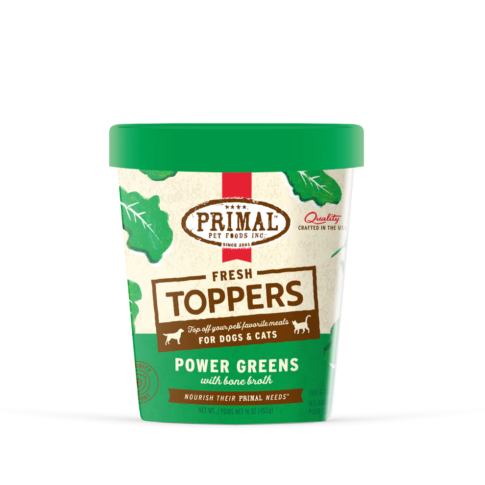 Aromatic whole-food toppers with specialized, functional ingredients—targeted towards digestion, immunity, or joint health! This Power Greens Fresh Topper is packed full of leafy greens, organic chia seeds, organic mushrooms, coconut oil, and sardine oil for a boost to your pet's immunity. Suitable for dogs or cats.